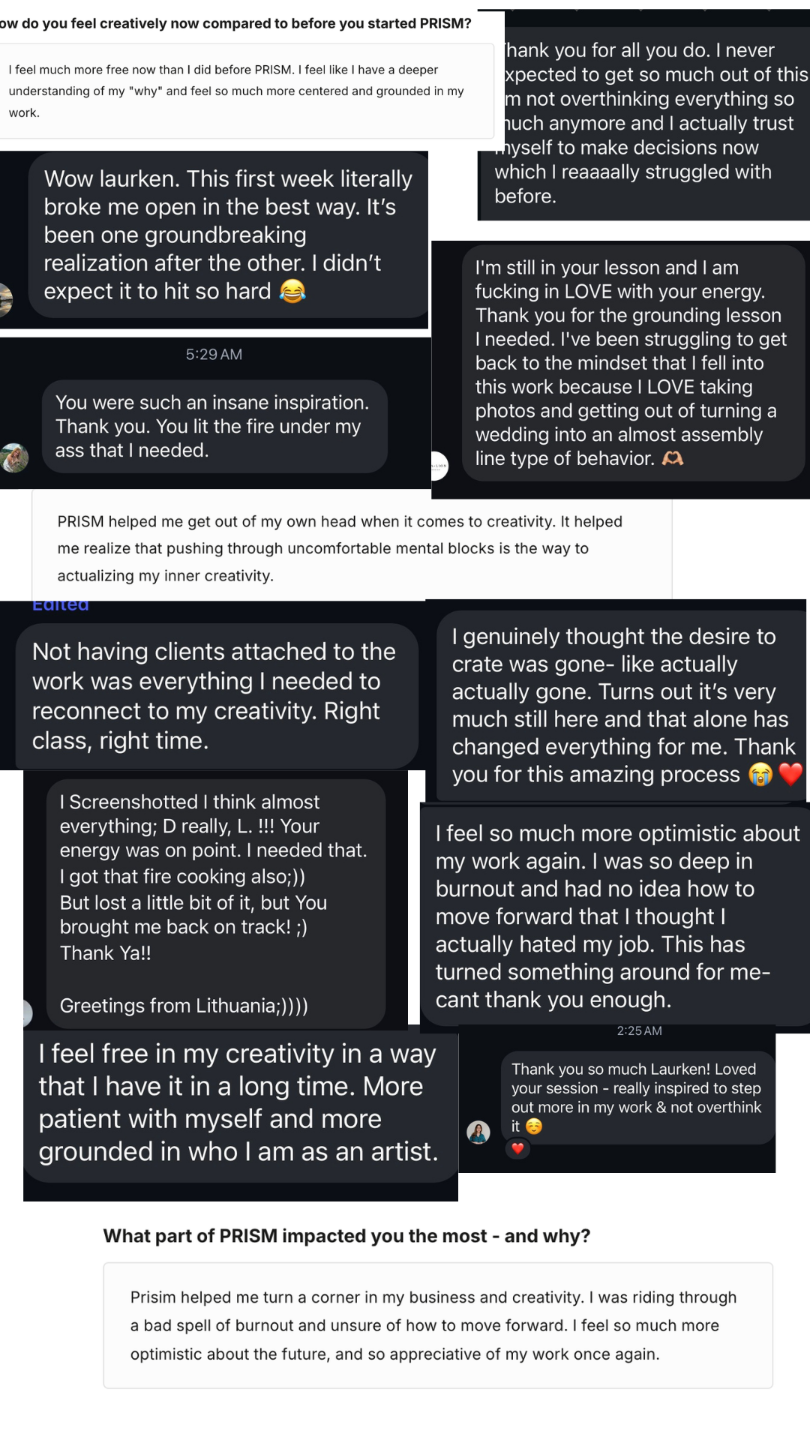 PRISM is a 4-week creative unblocking process for portrait and wedding photographers who have lost the excitement that brought them to this work in the first place.